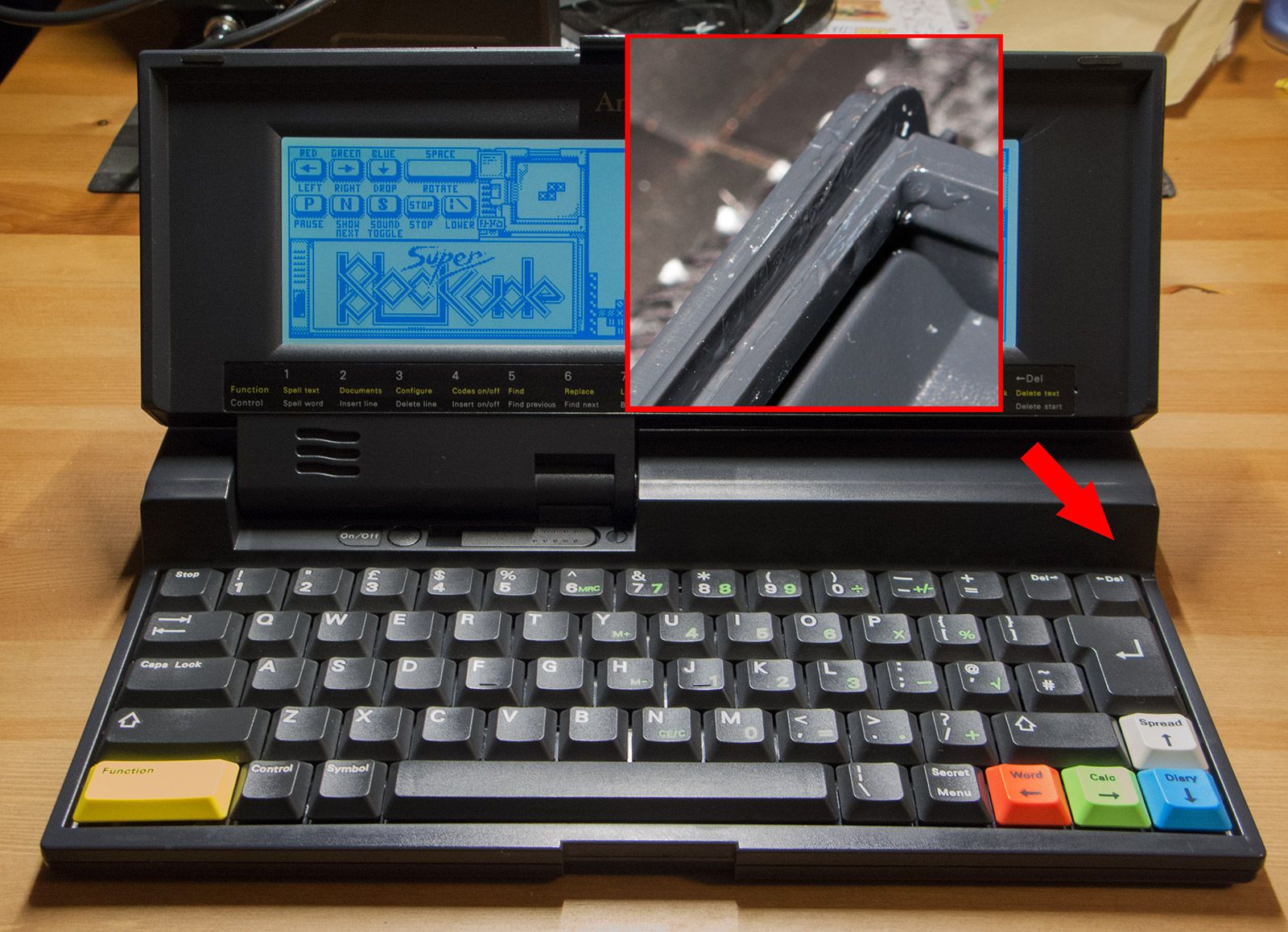 As I said at the beginning, there is something worth mentioning regarding the plastic used to make this computer. I found it not particularly robust when compared to a regular Amstrad CPC or Plus. My NC200 had a crack near the keyboard that I am sure appeared when somebody tried to open it in the past. There are also some small marks in the case because the same or other person introduced something in the gaps between the two shells, probably metallic, to separate them. I repaired the crack with epoxy and it is fine now but you really want to be careful when opening the laptop. What I did was to fill it with resin and add some extra epoxy around. It is all in the inner part of the shell and, therefore, not visible from the outside.